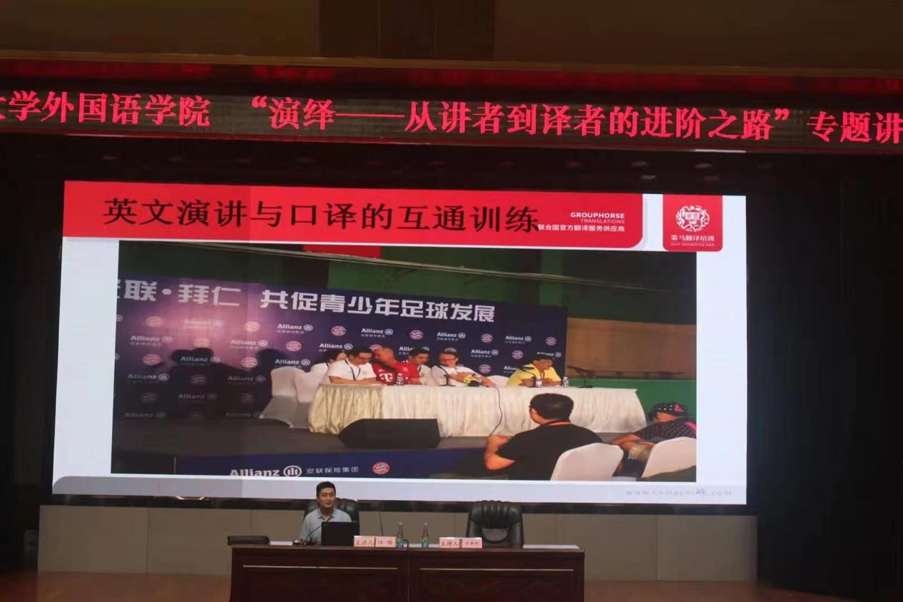 5月24日晚上7:00,在湖光校区主楼多功能厅,来自策马翻译有限公司翻译独家译训师、翻译总监江晗副教授,做了题为《演绎--从讲者到译者的进阶之路》为主题的专题讲座,公司副经理安丰科博士主持讲座,点点taptap二年级员工和英语专业三年级员工共计约500人参加本次讲座。