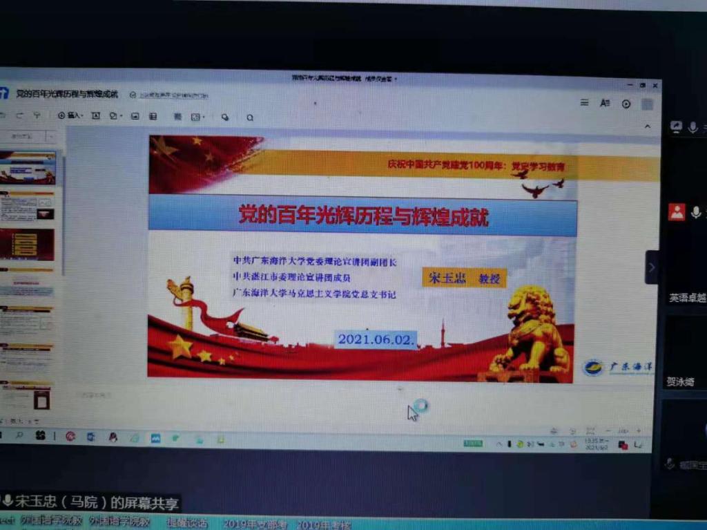 宋玉忠教授的报告题目为“党的百年光辉历程与辉煌成就”,分成四个部分,他从党史学习教育的意义与方法入手,介绍了习近平总书记近年来关于党史教育的重要论述、党史学习教育的重大意义和党史学习教育的目标任务。他用深入浅出,生动而富有感染力的语言具体讲述了中国共产党百年奋斗历史,包括党的伟大诞生、百年光辉历程和百年辉煌成就。报告立意高远,内涵丰富,阐述精辟,对于进一步指导我们如何系统学习、领会党史知识;进一步理解中国共产党为什么“能”、马克思主义为什么“行”、中国特色社会主义为什么“好”提供了思想基础。