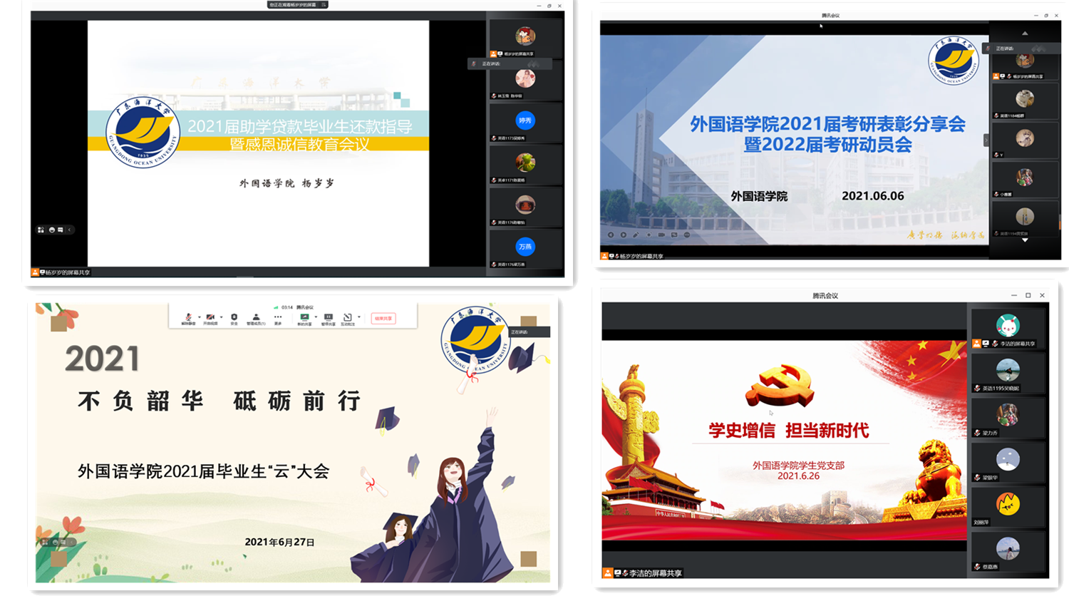 6月27日晚,公司召开“不负韶华 砥砺前行”欢送2021届毕业生“云”大会。点点taptap全体领导、毕业生班主任、辅导员及2021届毕业生200多人参加了会议。与会领导和老师们历数本届毕业生取得的各项优秀成绩,肯定了同学们的努力与付出,表达了对同学们的不舍和祝福,嘱咐同学们要坚持理想信念,懂得感恩,砥砺奋斗。外院优秀毕业生代表韦杨辉回顾了大学四年的美好时光,感恩母校的教育和培养,表达了对海大的依依不舍之情,2018级员工代表魏俊杰感谢即将毕业的师兄师姐们对后辈的帮助和指导,祝福他们乘风破浪、披荆斩棘、前程似锦。会议进行中,同学们纷纷在留言框写下了自己的不舍、对老师的感激以及对母校的祝福。