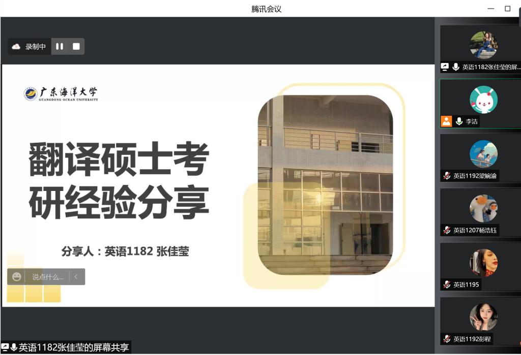 随后2018级何绮岚、何霜、张佳莹、伍颖昕、何倚琦等五名考取境内外研究生的同学结合切身经历细致分享院校专业选择、初试备考及复试经验,从考研的资料获取、时间分配到情绪管控,为学弟学妹提供了极具指导意义的方法和建议。师生相聚云端,气氛热烈,畅谈甚欢,为外院学子考研注入动力,极大地鼓舞学子们的考研热情,增强了学子们的考研信心,提振了学子们的考研士气!