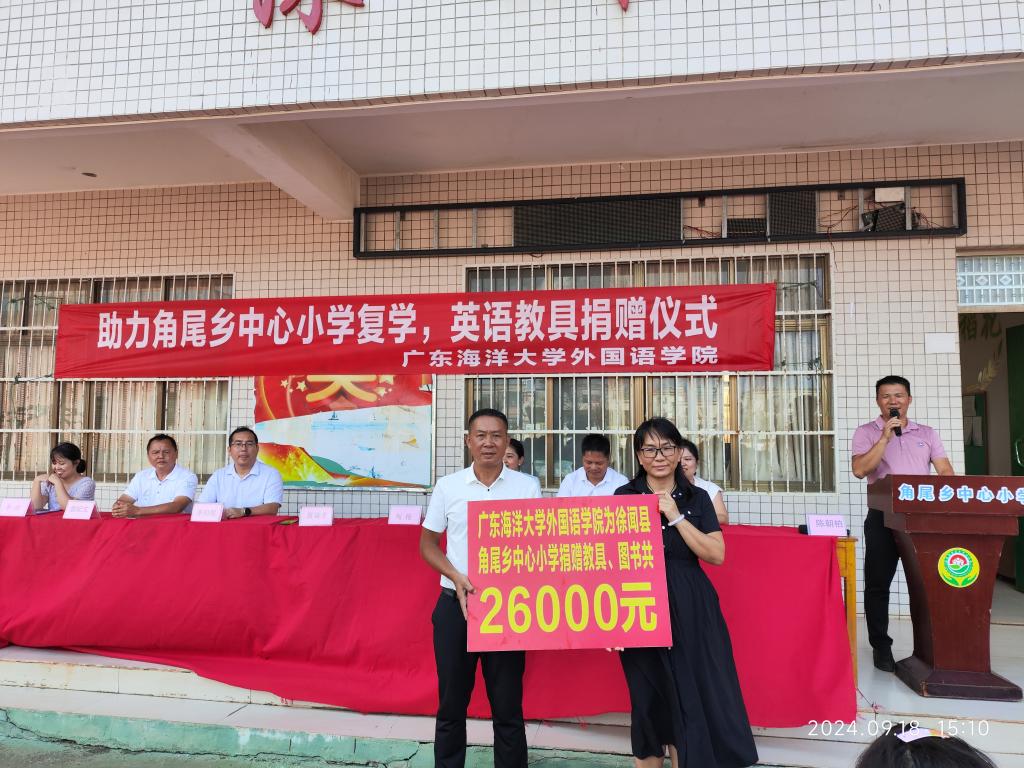超强台风“摩羯”袭击徐闻角尾乡,给校园造成巨大损失,严重影响了员工的正常学习。外国语公司迅速行动,组织全校师生捐赠一批中英文绘本读物、文具和英语教学中常用教具等相关资料赠给角尾乡中心小学及其附属5所分校,解决了英语课程教学中面临资源缺乏等困难。刘艳代表点点taptap对角尾乡中心小学表示慰问,并勉励与会同学,学好知识,向世界宣讲美丽家乡故事,展现自信自强的中国。