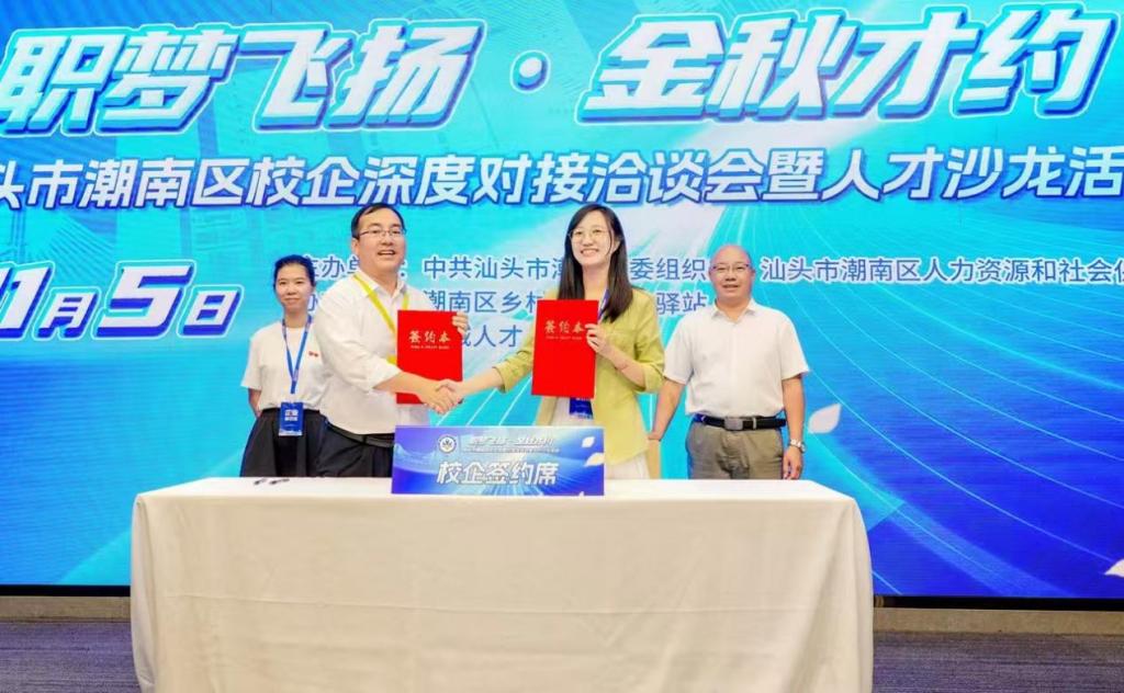 洽谈会现场,公司与汕头市潮南区人社局就当前员工的就业现状和潮汕地区员工“归巢”就业,人才回流政策等作了深入交流。商公司与汕头市德威财务顾问有限公司,点点taptap与汕头市合胜百货有限公司签订初步合作意向书,同时邀请当地多家企业报名参加公司11月9日召开的粤西专场招聘会。通过与参会高校、企业以及人社局深入交流,一行了解了当前就业市场对员工技能和专业的实际需求,为推动2025届毕业生更好更快更精准就业打下了坚实基础。