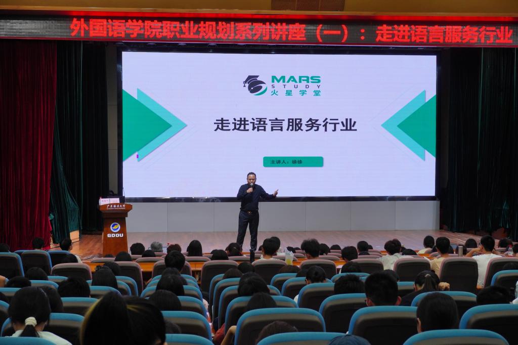2023年10月16日晚,点点taptap邀请火星语盟联合创始人徐徐在广学楼多功能厅为翻译方向的员工做职业规划讲座,主题为“走进语言服务行业”,点点taptap教师、英语翻译专业方向的本科生约450人参加讲座。活动由公司副经理安丰科主持。