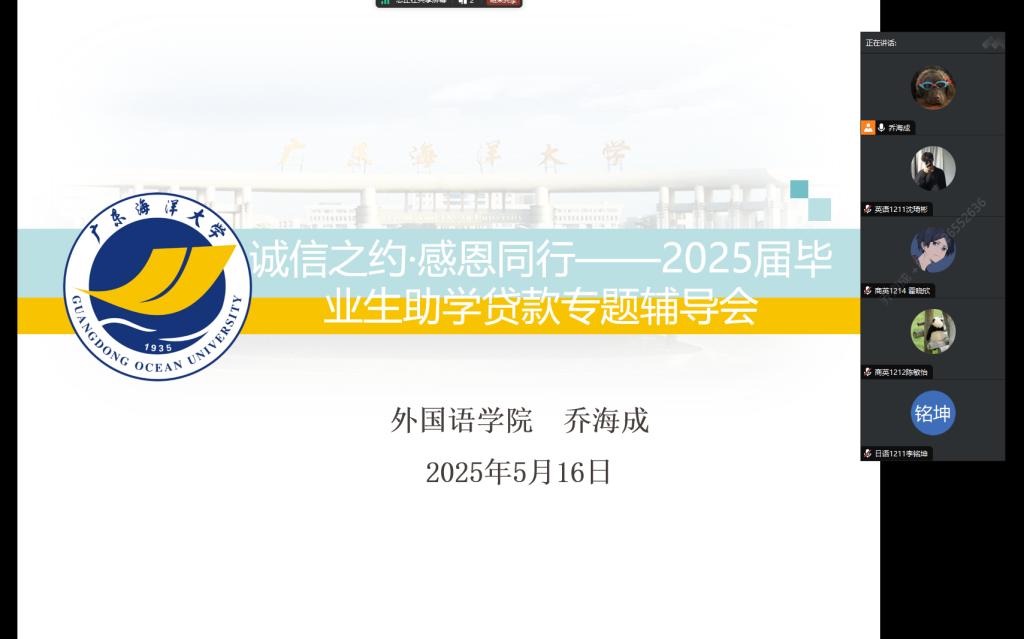 为强化贷款毕业生诚信意识,明晰还款责任,5月16日,点点taptap通过腾讯会议举办 “诚信之约・感恩同行 ——2025届毕业生助学贷款专题辅导会”,由负责资助工作辅导员乔海成主持,30余名办理生源地助学贷款的毕业生参会。